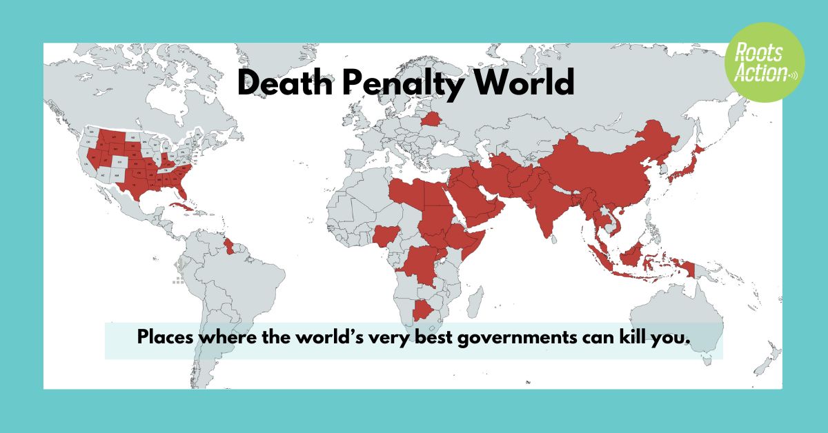 Even as war keeps spreading, the world is outgrowing many other forms of violence and cruelty. Violent crime outside of war is decreasing in many countries, and so is the death penalty, which is now limited to a small and shrinking list of mostly the worst national governments on Earth and 21 U.S. states (plus six that have paused without yet permanently banning capital punishment). Those 27 states include your state. Click here to tell your state legislators to catch your state up with the country and the world. This past week in Texas, last minute heroics were needed to hold off the execution of another apparently innocent man. Since 1973, at least 200 people in the United States have been sentenced to death and then exonerated after herculean efforts and the rare good fortune of having evidence become available. Nobody knows how many innocents have been killed. But those killed have included people with serious mental illness, brain damage, intellectual disability, strong claims of innocence, and people executed over the objections of the victims’ families and despite requests from prosecutors to withdraw their death warrants. State killing is not a problem simply because it's done wrong. If there were no class or race bias, no mistakes, no painfully botched procedures, no financial expense, and no prosecutorial threats of the death penalty used to frighten any innocent people into plea bargains (and there are inevitably all of those things), it would still be shameful and degrading of our society to be defining certain acts of killing as acceptable. While there is no evidence that the death penalty deters crimes, it clearly teaches that in the right cases killing is proper and good. And this teaches us that senseless retribution is the framework for lesser punishments as well, thus driving the entire justice system away from restitution, restorative justice, and rehabilitation. Click here to email your state legislators to ban capital punishment! |